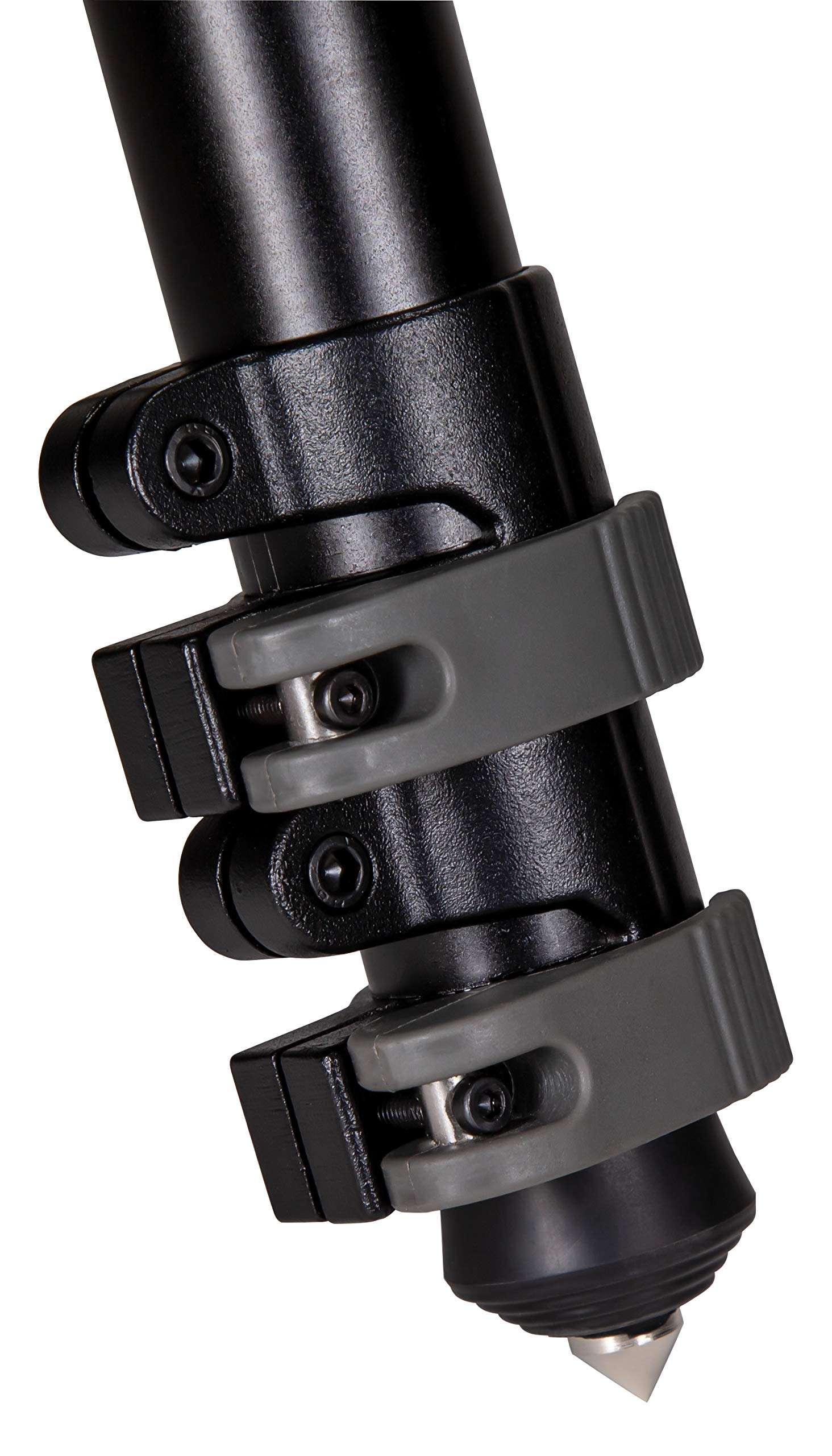 Designed with retractable steel spikes for grip on soft ground, a built-in bubble level for accurate setup, and quiet lever locks for smooth adjustments.